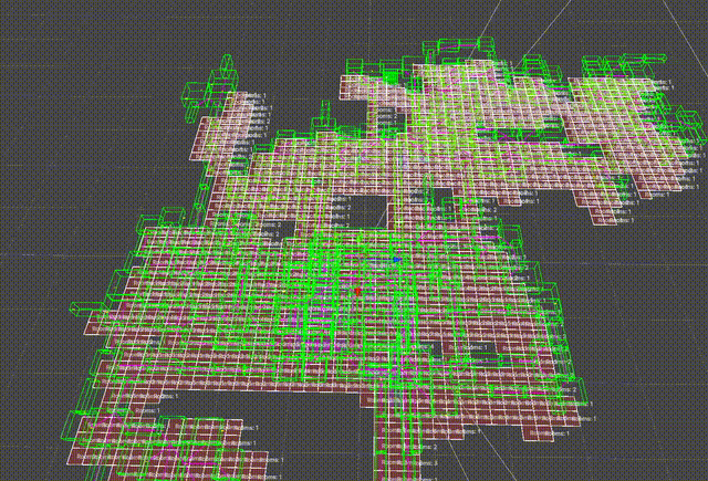 Bake time: The world is divided into a 3D grid. Each cell is validated (not inside solid geometry). Then rays are cast between all valid cell pairs to determine visibility.